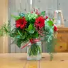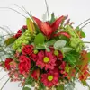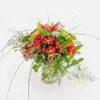Apasionante y silvestre, descubre este hermoso ramo con lilium, rosas, margaritas y gerberas. Su protagonista, el color rojo ¡un bouquet infalible! Ah, y con Jarrón Incluido. Descubre este bouquet de pequeño tamaño pero repleto de flores. 12 tallos en flor donde se combinan los tonos rojos del lilium, las rosas ramificadas, las margaritas y las gerberas con el lilium rosa y amimayus blanco; adornado con verdes decorativos y eucaliptus.