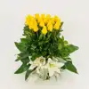 Vertical de 20 rosas color a elegir con verdes decorativos Composición de gran tamalo con 20 rosas a un mismo nivel acompañadas de delicados verdes decorativos ideal para cualquier ocasión