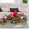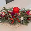 Una fusión armoniosa de elementos naturales es nuestro Centro de Mesa Alargado compuesto por delicadas flores de algodón, pequeñas ramas de ilex, tallos de eucalipto bola, craspedias rojas, ramas de abeto, piñas pequeñas, tallos de erengium y tallos de ruscus lila se entrelazan para crear un refugio invernal en tu mesa.Un bonito centro de mesa navideño en donde los tonos verdes se destacan elegantemente alrededor de una vela brillante, mientras que las craspedias rojas añaden un toque cálido y acogedor al ambiente. Te invitamos a sumergirte en la magia de la temporada con encanto y festividad.