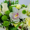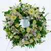 Corona funeraria elegante, compuesto por rosas, orquídeas, verdes deluxe ,medida pequeña de 65 cm de diámetro