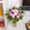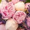 Descubre nuestro bouquet de flores peonia, una creación única con 10 peonias rosas, 3 peonias blancas, 1 pomo limonium, medio beargrass, verdes.