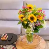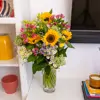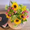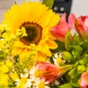 Descubre nuestro ramo de flores girasoles garden, una creación única con 5 girasoles, 1 pomo matricaria, 1 pomo limonium, 1 pomo solidago, 5 tallos alstromelia fucsia, 3 ramificadas amarillas, 5 tallos hinojo, verdes.