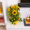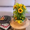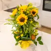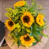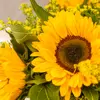 Descubre nuestro vertical de girasoles, una creación única con 5 girasoles, 1 pomo solidago, 3 leucospernus naranja, 3 tallos alstromelia amariila.