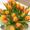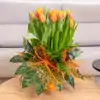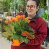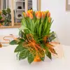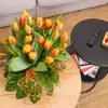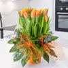 Dale un toque de color y calidez a los días más fríos del año con este elegante arreglo de tulipanes frescos en una base de latón. Su diseño combina la delicadeza de las flores de temporada con verdes decorativos que evocan frescura y vitalidad. Perfecto para iluminar cualquier rincón del hogar, oficina o recepción, este centro floral es una celebración de la belleza invernal en todo su esplendor.