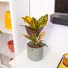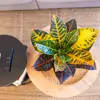 Planta de interior que posee la mayor gama de colores vivos en sus hojas. Sus hojas son duras y con nervaduras que van desde el amarillo hasta el rojizo. (Tiesto no incluido) Dentro de los Crotons existen muchas variedades de diferntes formas y colores en sus hojas. Puede alcanzar los 90 cm de alto. Los colores verdes, amarillos, naranjas y rojos se combinan en sus hojas. Si observamos que es originaria de las islas del Pacífico, marca mucho los cuidados de estas planta: la demanda de humedad.