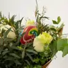 Sorprende a esa persona tan especial con este ramo de  rosas y piruletas de colores. Será un regalo divertido y alegre, ¡perfecto para una ocasión especial! Que mejor que endulzar el día a esa persona que nos quita una sonrisa de buena mañana? Con este ramo serás tú quien le saque una sonrisa y le haga el día más dulce y agradable. Se puede hacer mejor regalo? ¿Cómo hacer que tu ramo dure más? Primero hay que quitar el papel kraft que la envuelve para que la flor respire mejor. Cortar el tallo en diagonal 1 cm Pon tu ramo en un jarrón amplio con agua limpia Cambia el agua del florero cada dos días. Cuando los pétalos comiencen a marchitarse, retírelos para no dañar los demás pétalos